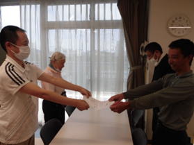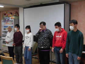 各作業班の今年の目標発表と、個々で絵馬の作成・発表を行いました。20歳になった方のお祝いをして、記念品のすずらんの家のお菓子と花束を贈呈しました。クイズ大会にも盛り上がった後、最後にお土産としてスワンベーカリーのドーナツセットが配られました。
